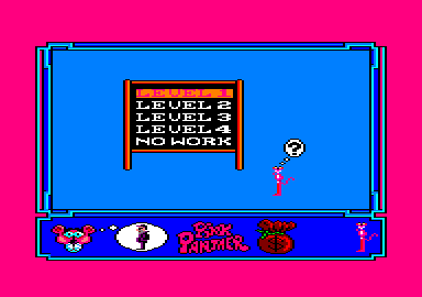 SORTEZ-MOI DE CE JEU ! Les deux premières maisons étaient déjà durailles à dévaliser, mais la troisième et la quatrième sont vraiment infernales ; encore plus de pièges et de murs, et un inspecteur Clouseau toujours sur mes basques. Cambrioleur, ce n'est vraiment plus un métier pour une honnête panthère rose. Si un Arsène Lupin amateur trouve la solution, qu'il ne se gêne pas pour me l'envoyer, sinon Clouseau va me transformer en tapis de sol. Ce qui ne saurait tarder tant ce jeu est difficile. Le premier qui me dit que l'argent volé est de l'argent facile, je le décalque contre le mur. Si vous pensez que c'est une sinécure de surveiller un handicapé du sommeil tout en remplissant son sac de butin et en essayant de semer Clouseau qui, même s'il est bête, court très vite. Des graphismes vraiment mignons, une musique qui possède le tempo de la bande originale du film, une animation sympa et quelques petits gags ; signalons notamment une tête de sanglier accrochée à un mur et dont les yeux vous suivent quand vous passez devant elle. Eclatant non ? Le tout est d'une bonne facture. Par ailleurs, c'est un jeu dont vous n'êtes pas près de voir la fin, tant tes possibilités de se faire coincer par l'inspecteur Clouzeau (la honte du Yard) sont nombreuses. Après avoir été un peu snobée par la rédaction, en grande partie à cause de sa difficulté, la panthère rose est en passe de devenÎT un petit personnage familier que, faisant fi de toute moralité, l'on encourage dans ses cambriolages. VIGOR le cambrioleur qui nettoie tout du soi au plafond. LA PANTHERE ROSE de MAGIC BYTES distribué par INFOGRAMES Disk : 160 F A100% n°4 , MAI 88