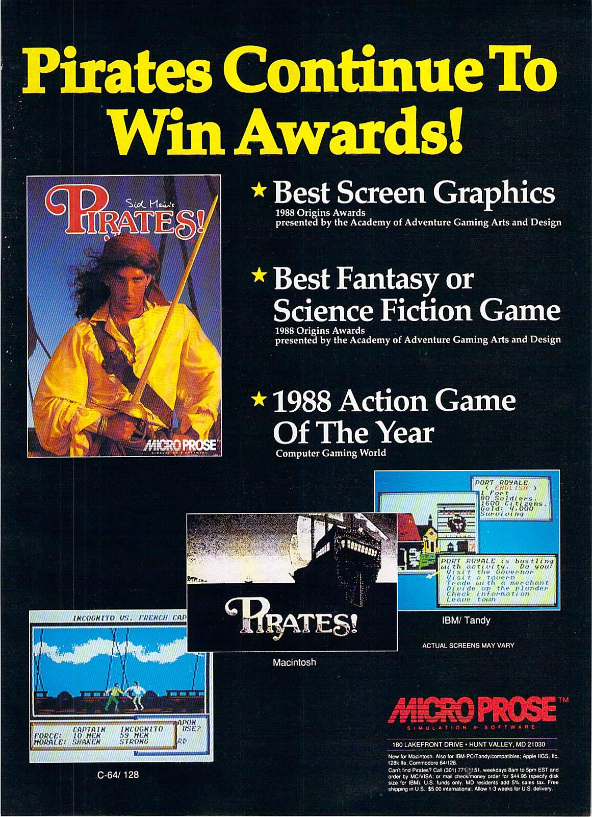 PIRATES est un logiciel parfait. En fait, c'est un simulateur de roman d'aventures... La documentation, très copieuse et passionnante, est en français. Le jeu a également été francisé, mais dommage, la traduction est innommable... Il est bien évidemment possible de sauver votre "carrière" sur disk. Heureusement, car pour faire le tour du logiciel, vous en avez au minimum pour trois mois. Remarquez, une fois qu'on connaît PIRATES, on a de toute manière beaucoup de mal à s'arrêter de jouer.