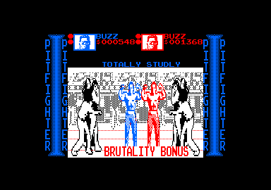 Pit-Fighter est un jeu de baston. Il fut une époque le roi de la bagarre « MSienne » : Matt- le-Fou aurait sauté sur l'occasion pour en faire le test. Comme il n'est plus là, c'est moi qui fais le sale travail. Et je me. trouve face à un jeu qui n'a ni queue ni tête... ACHETEZ MES LEGUMES! Le but du jeu est fort simple. La nouvelle saison de combat en arène vient de débuter. Le joueur (s'il est assez crétin pour acheter ce jeu) doit choisir son personnage entre trois gaillards nommés Ty, Kato et Buzz. Il va de soi que chacun de ces messieurs a un vécu et une expérience bien différents des autres. Le joueur (s'il est assez crétin pour acheter ce jeu) va affronter huit adversaires dans l'arène. Pour cela il va recevoir des coups de lattes dans les dents, des marrons pas très mûrs dans le bide, des pastèques portées en colIp de boule... A lui de trouver le bon légume qui, bien assaisonné, accompagnera le grand-costaud-pas-beau d'en face.