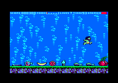 Le premier niveau est une mise en train et nous laisse apprécier les différentes subtilités du programme. Les monstres ne sont pas bien méchants il faut les assommer de deux, trois, voire cinq coups de massue selon qu'il s'agit d'un dino, d'un ours ou encore d'une tortue géante. Autour du crâne des malheureux tournent alors des étoiles du plus bel effet. On en aurait presque pitié s'il ne s'agissait pas de ... manger. Car en leur passant dessus pendant leur étourdissement, vous les faites directement entrer dans votre estomac. C'est magique,.. Vous remarquez en fin observateur qu'avant de vous attaquer sauvagement, chacune de ces charmantes bestioles surgit d'une caverne. Vous trouverez à l'intérieur un véritable garde-manger ; bananes, cerises et autres cuissots, mais aussi des vies supplémentaires ou bien des armes plus puissantes comme la hache. Avec cette dernière, un coup suffira où deux étaient nécessaires. Mais ne vous risquez pas dans les cavernes sans raison ! Certains aliments ne valent vraiment pas la peine qu'on se décarcasse. Il faut manger pour vivre, mais tout de même ...