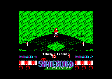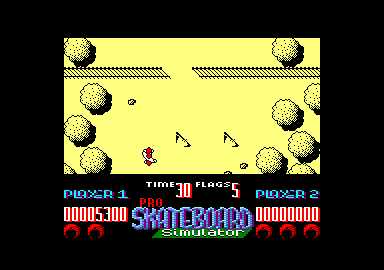 Toujours dans la série simulateur, nous sommes maintenant sur une planche à roulettes. Chacun des sept niveaux est divisé en deux parties. La première consiste à dévaler des pentes en ramassant des drapeaux, mais attention, certains d'entre eux vous obligeront à regrimper. Bien sûr, il ne faut pas sortir du chemin et tout ça dans un temps limité. Cela n'a rien d'une partie de plaisir, rien à voir avec les tranquilles descentes du Trocadéro. La seconde partie est un slalom à travers la campagne, où on doit éviter les obstacles naturels, comme l'eau ou les arbres. Je me demande s'il ne s'agit pas des dernières vacances de notre ami Budget. Peut-être a-t-il décidé de préparer Te tour du monde en skate. Il est un peu fou, c't homme-là !
