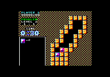 QUEL... (CENSURE DU SDR) Ah, voilà que les demoiselles du SDR se mettent à jouer du ciseau ! Mais si elles avaient été là quand j'ai testé le soft, elles en auraient entendu d'autres, je peux vous le dire. Enfin bon, je continue. Comme si le jeu n'était pas suffisamment corsé, ses inventeurs ont cru bon de devoir y ajouter une limite de temps. Ainsi dispose-t-on d'une minute pour les premiers tableaux, puis d'une minute trente lorsque la difficulté s'accroît. Le chrono se situe à droite de l'écran, en si gros caractères qu'il est impossible de le rater, à moins d'être une vraie taupe. En dessous du chrono, il y a une fenêtre à l'intérieur de laquelle s'affiche, au début de chaque tableau, le nombre de carrés à éliminer par famille et qui disparaissent au fur et à mesure qu'on les détruit. Par exemple, deux ronds rouges, deux triangles jaunes et quatre carrés verts. Ou encore deux pyramides bleues, quatre cubes violets et cinq ronds rouges. Quoi ?!? Comment se fait-ce (et là, ce n'est pas un lapsus) ? S'il y a un nombre impair et que les carrés se détruisent deux par deux, il en reste forcément un à la fin ! Non, pas si on s'arrange pour qu'un carré en touche deux au même moment. Je m'explique : si on a deux carrés posés par terre, espacés d'une case, et qu'on en fait tomber un juste entre eux, les trois carrés (de la même famille, bien sûr) se désintègrent UN JEU DE CON... CENTRATION Au début de chaque tableau, on dispose de quelques secondes avant que le chrono se mette en marche, secondes qu'il faut mettre à profit pour analyser rapidement la situation et élaborer un plan. Au début, les tableaux sont d'une simplicité enfantine, mais il permettent de se familiariser avec le système du jeu. Pour les balèzes comme les deux zouaves cités au début de l'article, il est possible d'accéder directement au deuxième ou au troisième niveau. Chose amusante, le deuxième niveau comprend deux degrés de difficulté, le troisième niveau trois degrés et ainsi de suite, chaque degré correspondant à trois tableaux différents. Autan! vous dire qu'avant d'arriver au huitième degré du huitième niveau, vous aurez le temps de vous flinguer cent fois ! Dès le deuxième niveau, les choses se compliquent avec l'apparition de petits ascenseurs. Tous les ingrédients d'un superbe casse-tête sont alors réunis, et les amateurs du genre pourront alors prendre leur pied. Moi, j'ai trouvé que les ascenseurs n'allaient pas assez vite et plutôt que de les attendre, j'ai piqué une crise en hurlant : "Priiiise de tête!"