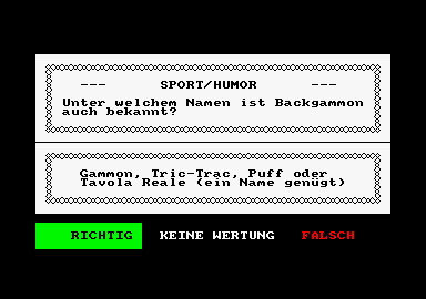 Das Spiel kann mit dem Joystick oder über die Tastatur gesteuert werden. Wenn das Spiel geladen ist, geben Sie die Namen Ihrer Spielpartner ein. (Wie bei der Schreibmaschinen-Tastatur können Groß- und Kleinschreibung sowie Umlaute verwendet werden). Mit der DEL-Taste können Sie eventuelle Tippfehler korrigieren. Mit Cursor rauf/runter erreichen Sie die anderen Eingabefelder. Nachdem alle Namen eingegeben sind, drücken Sie „zur Bestätigung” die f1-Taste. Jetzt müssen Sie nur noch bestimmen (1-3), wie viele richtige Antworten pro Gebiet gelöst werden müssen. QUIWI, unser „Master” , zeigt Ihnen auf dem Screen, wer an der Reihe ist. Der große Stapel mit den Fragen über Quiwi zeigt die sechs Wissensgebiete und die bisher erreichte Anzahl richtiger Antworten - mit „Eulen“. Danach finden Sie sich auf einer Wiese wieder, auf der eine große Zielscheibe steht. QUIWI spannt seinen Bogen, und Sie bestimmen per Knopfdruck, welches Wissensgebiet Sie treffen möchten. Manchmal klappts mit den Schießkünsten auch nicht so gut. Dann allerdings müssen Sie sich den Fragen aus einer anderen Gruppe stellen. QUIWI von Kingsoft ist ein interessantes Spiel. Bei mehrmaligem Testen fiel mir (positiv) auf, daß der Computer nicht „immer die gleichen Fragen rausspuckt”. QUIWI ist zweifelsohne ein lehrreiches Spiel für die Party-Gesellschaft oder für die Familie. Die Fragen sind teilweise zu „schwammig“ gestellt und lassen demzufolge mehrere Antworten zu. Was in der Abteilung „Wissenschaft & Technik” allerdings die Frage: „Welcher Vogel fliegt lautlos?”(Antwort: die EULE) zu suchen hat, bleibt wohl für alle Zeit ein Geheimnis. Aber: Jedes Programm hat seine kleinen Schwächen. QUIWI hingegen ist ein wirklich spaßiges wie unterhaltsames und lehrreiches Programm, wenn man mir diese Wiederholung von vorher verzeihen mag. Empfehlenswert! Außerdem hat KINGSOFT dieses Quiz für zahlreiche Rechner „brauchbar“ gemacht und dies zu einem wahrhaft günstigen Preis!