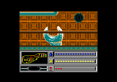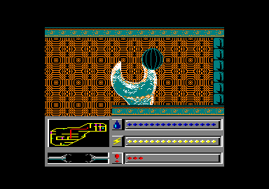 The engines are turned on and off with switches; so is the scanner which shows the ship's position. You'll have a good deal of frustration finding out which ones to use - but once learnt, never forgotten. Some switches control the locks for doors so that when you settle into them and activate you're presented with a colour-coded puzzle that has to be solved. You have to activate the eight sections of a hexagon to the same colour, complicated by the fact that the sections cycle through several colours and alter in sequences. Some locks are harder than others, depending on the alteration pattern. It's a bit like trying to solve Rubik's cube, only not as tough. There are three indicators on the display: fuel, power and danger. The one that will cause the most immediate problem is the power gauge running down. However, in the long term the danger gauge sets the effective time limit for completing tasks. The graphics are excellent, abstract and attractive. The gameplay is superb, combining the best elements of puzzling with an enjoyable control method. The weird environment and the original features like switches make game special. It's quite stunning for a budget game and is worth £2 of anyone's money to experience it. BW, AA |