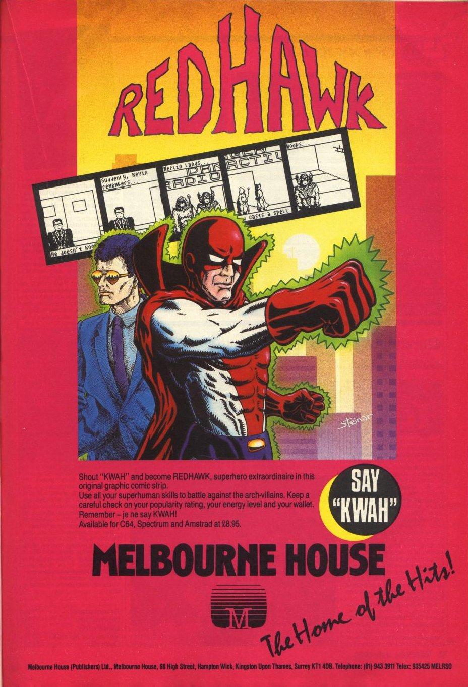 Redhawk n'est pas seulement un super-héros, c'est aussi et surtout un banal étudiant, le gentil Kevin, qui ne devient le Faucon Rouge qu'après avoir crié KWAH ! Et ce pour un temps limité... Quand l'aventure commence, Kevin est à l'hôpital, sans trop savoir pourquoi. L'écran du jeu impressionne tout de suite : trois images successives en haut de l'écran ! Car nous sommes dans une vraie bande dessinée : au fur et à mesure des actions du joueur, les images défilent, comme si on lisait. Très amusant, d'autant que des bulles viennent reproduire les dialogues, des légendes rappellent à chaque image l'action effectuée ! En dessous, une pendule, et deux jauges. La première évalue l'énergie du héros : quand il est Kevin, elle monte. Quand il est Redhawk, elle descend. A zéro, Redhawk redevient Kevin, qui doit attendre de se recharger avant de pouvoir à nouveau crier « Kwah ! ». Donc, vous l'avez deviné, il vaut mieux entreprendre toute action dangereuse avec une bonne marge de sécurité en énergie : sinon, Redhawk redevient faible étudiant au plus fort de la bagarre et retourne... où ? A l'hôpital, bien sûr ! Tout se tient...
