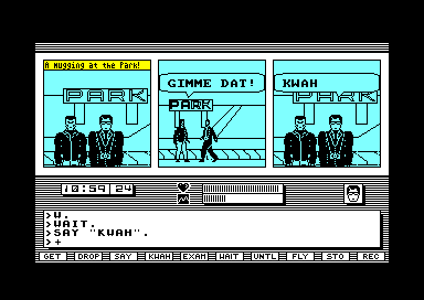 The story that's sketched out on these pages concerns one Kevin, who can't remember anything except the word 'Kwah' which, if he says it (or rather, if you type it) transforms him into a superhero - Redhawk. Redhawk's mission in the game is to stop a team of super-baddies (including Merlin, Fusor, and The Rat) from blowing up the local power-station. You play by entering text commands as normal in a window below the comic strip, which are then either acted on or rejected by the program. The parser is rather mysterious - it appears to be impressive at first by swallowing some very complex inputs, such as SAY "HELLO" TO LESLEY but then rather spoils this impression by responding "OPEN" CONFUSES KEVIN when you enter OPEN DOOR. Other, similarly basic commands are sometimes likewise rejected and the feeling after playing for a while is that the input system is somewhat frustrating and the real vocabulary rather small. Apart from trying to stop the baddies, Redhawk/Kevin has to increase his local street credibility by nabbing the occasional baddie. There's a small meter that shows how popular you are, and the level rises when you, say, arrest a mugger and take him to the police station. Popularity is essential otherwise certain characters will not co-operate and life becomes rather difficult. You also have to keep a close eye on your energy level. Kevin, paradoxically, appears to have unlimited energy whereas Redhawk soon runs out of steam, especially if you try 'flying' everywhere instead of walking. At this point the Pilg casts his eyse back over the lines above and realises that it all sounds terribly impressive. Unfortunately in practice the game just didn't grab me at all. First, it's slow. In any normal adventure it's a drag to be told 'You can't go in that direction', but in Redhawk it's a positive annoyance as you have to wait for a new picture to be drawn, with the caption 'Kevin tries to go north but doesn't succeed'. The constant redrawing of the pictures would be OK if the graphics were something to write home about, but they're not. They're rather crude line drawings that seem acceptable for the first five minutes but, after you've seen them several times, become almost unbearably monotonous. The most successful comic strips nowadays tend to be well drawn - that's part of their appeal, but Redhawk misses out badly here. Occasional speech bubbles are drawn above appropriate characters and some of these show glimmerings of humour. ARREST ME, REDDUCK shouts a mugger defiantly in the park, which might raise a smile the first time, but elicits only a groan the second time, and after the third time (and the third wait while the message is printed) the Pilg felt like switching off. I persevered however. There are some reasonable puzzles to be solved here, and the novelty of the comic strip approach holds up for a while. But in the end the poor graphics begin to win out over the mediocre text, the slow pace becomes a major irritation, the erratic parser becomes simply a frustration, and you're left wondering what else you might have spent your £8.95 on. ...And you're also left wondering what someone like Mike Singleton of Lords of Midnight fame could have done with an idea like this. Ah well... AA |
