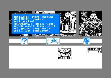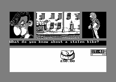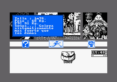 Tout ceci explique ma présence dans ces quartiers populaires à la recherche des pièces manquantes du puzzle mobylettesque. Le temps me presse puisque je dois être prêt à partir de 18h30, sinon ma mie ira se jeter dans les bras de l'infâme Dédé. Marche à l'ombre se présente comme un jeu d'aventure, parsemé de scènes d'arcade (plutôt orientées "castagne"). Cinq fenêtres ouvrent leurs volets : la première est une représentaton de votre état physique, la seconde vous situe dans le décor, la troisième affiche votre niveau d'énergie sous forme d'une chope de bière plus ou moins remplie, la quatrième contient les dialogues entre les personnages et enfin la cinquième expose les objets en votre possession, entre autres, les pièces manquantes de votre mobylette. Pour récupérer les morceaux de la monture, il suffit de se battre et de gagner contre les adversaires que vous ne manquerez pas de croiser lors de vos périgrinations. Surveillez donc le niveau de votre chope, lorsque celui-ci présente des signes de faiblesse, allez vous "resourcer" auprès de votre bar favori. Ce n'est pas le seul problème : il faut également acheter les fameux billets pour le concert de Renaud. Cela ne va pas être évident : la disquaire n'a plus de billets et votre porte-monnaie voit ses 500 francs diminuer assez régulièrement. Dommage que le jeu soit en noir et blanc, mais peut-être est-ce plus "chébran".