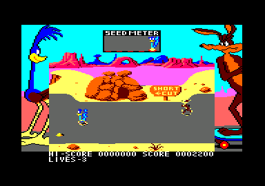 A chaque niveau, il y a également des obstacles ou des pièges ; par exemple, ce sont des bolides qui écrasent tout sur leur chemin ou le coyote juché sur un bâton de dynamite... Enfin, n'oubliez pas qu'en cas de chute, il existe des short cuts qui vous emmènent directement au dernier niveau joué. AMSTAR n40, p85 |