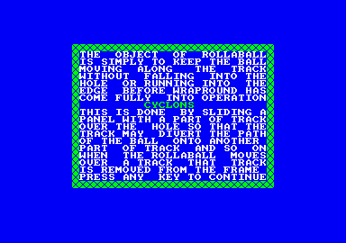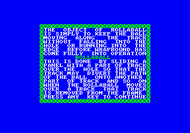 I have to admit that this is a very original game and one that I have never seen before. The aim is to keep the ball rolling around the complex track displayed on screen. This consists of roads which criss cross and intersect with the others at junctions. You have a panel which you slide around the board changing the nature of these junctions as you do so. If you are careful and can follow the road along its path you can keep the ball rolling until the Wraparound effect comes into play. This means that the ball will go off one edge and then return on; the opposite edge and makes the game a little easier. The instructions, on screen only, are inadequate and only I confused me. You have to play a; I number of moves before you get j 1 the idea at all. There is a good screen appearance but the game lacks the quality that you would expect from this capable machine. More colour and sound could have been given and bonus screens could have been used too. D.C.