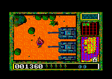 In 1999 (do try and keep up with current events!) the countries of the world nave combined to form the World Council which governs the Earth. After six months a fanatical party under the leadership of Dr Q left the council. He's planted a nuclear bomb in New York and threatens to detonate it. You have been chosen to go to the island, find all the bits of the timing device, re-assemble them and save New York. The playing area is a four way scrolling section of the island viewed from above. To the right is a map of the whole island and a four by four grid that fills up with pieces of the timer as you find them. Your score, lives and grenades are across the bottom of the screen. Dr Q hasn't left his island unguarded though, for there are tanks, soldiers, minefields and mazes all over the island. (Hint: a good way of finding mines is to step on one.) Extra weapons can be pinked up and you've also got to keep an eye out for pieces of timer. If you collect all fifteen pieces the remaining time is available to you to reassemble them into the shape shown before play begins. Do that and New York is saved, fail and it's time for the big firework to go off.