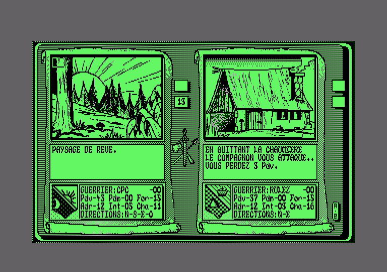 Eh ben c'est pas trop tôt. Cela commençait à sérieusement nous manquer. Faut croire que le creux de la vague est passé et enfin messieurs les éditeurs comprennent que les aventuriers boulimiques que nous sommes, n'ont depuis de longs mois trouvé pain à leur bouche. UN MERLUX VAUT MIEUX QUE DEUX MERLANS TU L'AURAS Depuis longtemps vous passiez d'agréables moments à vous la couler douce. La vie était belle, les oiseaux chantaient leur plus beau récital, l'odeur du chocolat arrivant sur un plateau dans votre lit vous servait de réveille-midi, la brise du soir... Bref, vous n'en foutiez pas une, jusqu'au jour où votre tuteur Merlux vous fit parvenir un petit mot par la poste régionale. Il vous demandait un sacrifice énorme, celui de laisser tomber votre vie de tout repos et d'accourir pour lui venir en aide. Voilà, le décor est posé. Il ne reste plus qu'à lancer l'aventure pour affronter les différents pièges et autres difficultés prévues par l'esprit sadique des programmeurs. TES QUI TOI ? Vous avez la possibilité d'incarner un ou deux personnages choisis entre le magicien, l'elfe, le prêtre, l'assassin, le guerrier et le paladin. Tous ces personnages sont caractérisés par des points de vie (leur résistance aux difficultés), des points de magie (leur capacité à lancer des sorts), la force (la périphérie de leurs biceps), l'adresse (précision lors des combats ou l'utilisation des pouvoirs magiques), l'intelligence (le niveau de leurs études) et enfin, la chance (leur potentialité à gagner au loto). iL va de soi que chacun trouvera son bonheur parmi le choix proposé, tout en sachant qu'il est difficile de demander à monsieur le curé d'affronter les... (je ne vous le dirai pas) ou encore de demander au guerrier de faire des miracles. DEUX ECRANS VALENT MIEUX QUE... Désolé, je ne m'en lasserai pas. L'écran de votre CPC est partagé en deux. Dans la fenêtre de gauche, vous aurez la vue du lieu de vos galères, avec une liste détaillée de tous les points caractérisant votre personnage. Cette liste cède sa place pour faire apparaître le menu des diverses actions réalisables par le joueur. Vous pourrez ainsi effectuer les déplacements (quatre directions cardinales). Prendre, poser, utiliser, donner ou lister les objets en votre possession. Engager une conversation ou, plus énergiquement, attaquer votre interlocuteur : vous aurez ainsi le choix des armes (à main nue, a l'aide de votre arme ou par la magie). Ouvrir portes, boîtes, cercueils et... (non, non, je ne le dirai pas). LA MODE Avec Saga, ne vous attendez pas à en prendre plein la vue grâce à une palette choisie parmi les trois millions neuf cent quarante-sept mille deux cent trente-deux couleurs offertes par nos machines. Les auteurs ont tout simplement choisi la haute résolution des CPC (mode 2. 640x200 en deux couleurs). Le résultat : une finesse dans les graphismes rarement atteinte dans les jeux d'aventure. Vous pouvez également sauvegarder vos personnages et encore mieux, enregistrer l'aventure sur votre disquette pour la reprendre après le coucher de la maisonnée. La gestion se fait au clavier ou au joystick, c'est à vous de choisir l'ustensile de communication avec le CPC en début de partie. Pour la petite anecdote, sachez que ce jeu est full compatible sur toutes les machines Amstrad, avec un petit plus sur les versions 6128 (possédant 64 kilo-octets de Ram supplémentaires), les images du jeu étant chargées en quatre fois (d'où un gain de temps considérable). QUATRE MONDES EN UN Sachez que le monde de Saga est partagé en quatre : votre village, qui respire la magie des contes de fées mais qu'il faudra néanmoins quitter. Plus loin, un monde qui fera rougir les pyramides d'Egypte. Vous visiterez ensuite un autre village, digne des grands noms de la littérature fantastî-co-macabre (non, ce n'est pas un indice). Pour terminer... là où les héros doivent finir un jour ou l'autre (vous le saurez peut-être un jour). Je sais, cela reste très vague mais croyez-moi, vous me remercierez plus tard de mon silence. Poum le magicien A100% n°33 |