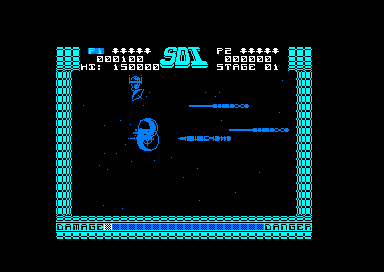 CIEL, DES MISSILES Toujours aux commandes de mon petit satellite, j'observe le ciel étoile. Les nouvelles technologies ont permis à nos savants de créer un véritable barrage contre les vagues de missiles soviétiques. Ces derniers temps, les relations internationales se tendant, nous avons tous été mis en alerte. Bien sûr, nous dirigeons les satellites d'une base spatiale située sur la Lune. Vous ne voulez tout de même pas qu'ils nous fassent monter dans leur tas de ferraille et nous décongèlent à distance le moment venu, pour diriger ces petites merveilles issues des progrès de la science sans conscience. CIEL, DES CHASSEURS Le fait d'être extérieur à ma machine me rassure. Si vous voyiez ce qui lui arrive dessus, ilya longtemps que, pour ma part, j'aurais branché mes petits moteurs auxiliaires et que je serais rentré me coucher. Si. effectivement, les moteurs auxiliaires se mettent en branle, ce n'est pas pour fuir mais pour mieux appréhender les missiles ennemis et, surtout, pour se protéger des chasseurs de satellites, qui ne tardent pas à se manifester. Niais se protéger n'est pas tout. Comme dit le vieil adage "un bon ennemi est un ennemi mort", ne pas le laisser sortir de mon champ de vision fait aussi partie de ma mission. La première vague de missiles vient de la droite, mais comme ils ne veulent pas faire de politique, cela change à chaque tableau, un coup à gauche, un coup en bas et même, et là je ne rigole pas, certains viennent d'en haut. On a beau dire que tout ce qui tombe du ciel est béni, il y a des limites.