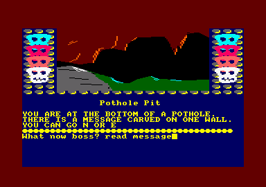 This game has several amusing touches - it occasionally flashes up witty remarks on the screen, has an enjoyable variety of responses to your inputs, and even manages some quite decent pictures. You find yourself trapped in a complex of caves, and must avenge the death of a sailor long dead in order to avoid being cursed and suffering a hideous fate. The plot idea is in fact quite original and, together with the good humour, this game could have had a lot going for it. But, sadly, it hasn't been carefully enough programmed to make the grade. For a start, the ESC key hasn't been disabled, and since the program is on tape and takes quite a while to load, hitting the wrong key can be very annoying. Furthermore, some of the responses simply don't make sense and lead to a general sense of frustration. Being asked ‘What's that 'e be saying??' may be amusing first time round, but after a while it gets rather tedious. Also, some of the fill routines for the pictures are faulty, resulting in colour escaping from trapped areas and bleeding across the screen. Nevertheless, the program does accept some quite complex inputs, and there are some suitably gory touches. At one point, if you're not quick enough to escape, Blackbeard's Ghost crawls out of a chasm to give you a hard time, and the descriptions are really pretty gruesome. But overall, Smuggler's Cove can be recommended only to those with patience, a greed for gold, and a forgiving attitude to sloppy programming.