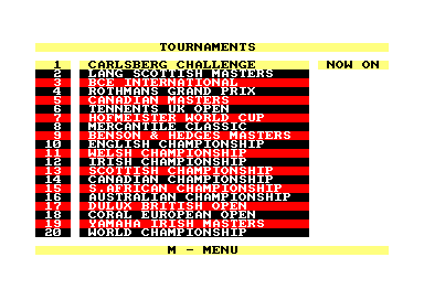 Andy Boring, boring, boring. Snooker's a yawn, except of course when someone's wig falls off, or a playe-.gets a rip in his pantaloons as he's taking a tough shot. But snooker management? Treble yawn! If that title doesn't immediately grab you and make you shake with joy, then you're not likely to be overly enthralled by the actual gamey content. Y'see, what you've got to do is manage a player. This means arranging games, paying the player, getting him into tournaments and arranging practise sessions. No doubt you've heard it all before, but I might as well tell you about it anyway. Ho hum. You start off with about five grand in the bank and the idea is to get rich by making sure your snooker star wins lots of games (and doesn't get a cent for his efforts). If things go horribly wrong you can always make a trip to the bank or the local loan shark. (Which amounts to pretty much the same thing if you ask me!) When you decide that the time is right for a match, you can choose to play either a club chappy or a celeb. The screen then switches to the game sequence. At this point you can choose to see either the final score or the blow by blow account. However, this is shown entirely in text and is as thrilling as reading the British Rail time table sdrawkcab. I'm terribly sorry and everything, but Snooker Management is awful. If you do get a thrill out of number crunching games, then I'm sure you'll have hours of fun. (You're also dead weird!) Pass the tourniquet. Cyril! I think my pulse has" dropped below 20 again. (Phew! Dire snooker games can be harmful to your health!) .