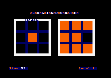 THIS intriguing puzzle will test your ability to think logically. On the screen are two 3x3 grids and you must make the one on the right match the target pattern on the left. If you manage It, there are two more for you to have a go at. To make things more challenging there's a time limit of one minute on the first level and even less on subsequent ones. The idea is that the keys 1 to 9 on the numeric keypad correspond to the squares in the grid. Pressing a key reverses the colour of that square, plus others based on the following rules: The corner keys - 1,3,7,9 - flip the colours of the four squares in that corner. For instance, pressing 7 reverses the squares corresponding to 7,8,4 and 5. Keys in the centre of an edge -2,4,6,8 - flip the three squares on the edge, and the centre key, 5, switches the five squares which form the central cross. You can only change colours when the key you press matches a black square. If it's orange, nothing will happen. Of course if you inadvertantly turn the entire grid orange, you can't go any further and will have failed in your task. The program will detect this and give you the option of restarting the game. The data that defines the starting position and shape of the targets is clearly marked at the end of the program, so you can easily create new puzzles when you complete this one. In the target data each row is a level and the first three items are the first row in the grid, and so on. Good luck. Nobody here has managed it yet without cheating! CWTA |