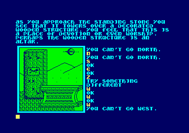 „Good-Seller “-Darkon SOULS OF DARKON, ein Spiel, das sich in England gut verkauft, führt uns in die Welt der Vergangenheit. Ein einsamer Abenteurer versucht sein Volk, welches vom Tyrannen DARKON unterdrückt wird, zu befreien. Er muß ihn finden und töten. Der Mutige wird ständig von einem fliegenden Roboter begleitet, der ihm die „Drecksarbeit” abnimmt. Stärken und Schwächen bei diesem Adventure halten sich aber leider nicht die Waage: Gut ist das Schriftbild und die zahlreichen Hilfen (Help und Legend). Die Schwächen liegen eindeutig auf der stark limitierten Anzahl der Vocabeln, die das Programm versteht. Ich habe dem Programm einen einfachen Test unterworfen; es war sichtlich überfordert! Beispiel: „Use Affe” (einfach ein dummes deutsches Wort benutzt), der Computer meldete: „I can't accept that ”. Dann ein zweites Mal: „Use Affe “, Computer: „Try something different!” Beim dritten Mal: Computer: „I don't unterstand ”. Beim vierten „Use Affe” hintereinander meldete er sich: „Try a Verb from the Vocab Table. ”. Dan-nach reichte es mir. „Interessant auch: Wörter wie Use, Find oder Look for fehlen gänzlich. Ein weiteres Manko: die wahrlich nicht berauschende Grafik. Dennoch sollte man auch etwas Gutes an SOULS OF DARKON nicht vergessen. Es ist gut überschaubar und besitzt einen hohen Schwierigkeitsgrad; auch Überraschungsmomente sind hervorragend eingebaut.