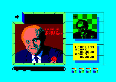 Il faut faire vite car ce cocktail molotov explose dans les cinq secondes en emportant avec lui une de vos trois vies. Si vous n'y prenez garde, le nez de Reagan disparaît par une des portes coulissantes pour ne plus revenir. Tout est question de tactique et de réflexe. Les personnages digitalisés sont empruntés à l'actualité anglo-saxonne : Lady Di et Charles. Clive Sinclair, Maggy ... Ce « célébrités en kit » est un jeu original , beaucoup plus ardu qu'il n'y paraît à première vue. TILT n°35 Oct 86 |
