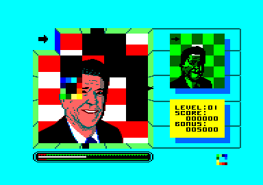 Si vous aime? les puzzles ce jeu devrait vous intéresser. Il s'agit de construire une image représentant un des multiples personnages proposés (Ronald Reagan, Margaret Thatcher, Mike Jagger et bien d'autres)- Contrairement aux puzzles classiques, vous ne disposez pas d'emblée de toutes les pièces nécessaires. Vous introduisez un à un les différents morceaux dont certains se révèlent immédiatement dangereux. C'est le cas de la bombe. Elle explose au bout de cinq secondes. Pour s'en débarrasser, deux solutions: l'évacuer au plus vite par l'une des portes mobiles qui apparaissent rapidement sur les bords du puzzle ou la neutraliser en la mettant en contact avec un robinet d'eau, ce qui, du même coup, (ait gagner un bonus. Ailleurs il peut s'agir de diamants qui, mis ensemble, vous font gagner une minute de réflexion. La balle en contact avec le pistolet double le bonus. En revanche, il est très dangereux d'approcher l'allumette de l'essence. Dans ce cas, tout explose et vous perdez une vie. Enfin, certains autres éléments (marteau, tasse de café, glace) ont des effets imprévisibles. Dès que vous appariez deux éléments étrangers au dessin, ils disparaissent. Ce qui vous permet de libérer la place correspondante pour le puzzle proprement dit. L'autre manière de « faire le ménage » est d'utiliser les portes pour évacuer les éléments indésirables. Vous voyez que le jeu n'est pas simple.
