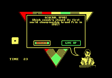 Test your sporting knowledge in this spin-off from the gogglebox. Well 'arry .... Sporting Triangles might sound like a menage a trois at a golf club but in reality it's nothing so fruity or interesting, but rather a quiz game based on ITV's answer to A Question of Sport. Unfortunately for ITV, Sporting Triangles was a fairly witless and pale imitation of the BBC programme, and suffered appropriately. A game based on this particular sporting quiz show isn't necessarily a bad thing, for one thing you don't have to watch embarrassed sports 'personalities'wondering why their agent got them into this. On the down side you do have to wait quite some time for the game to load and set itself up, even on disc this takes absolutely ages. There can be up to three human players, with the computer filling in for absentees. The computer plays on three skill levels: average, good and perfect. Or as we discovered, good, very good and unbeatable. A time limit can be set on each round, which stops dull and oafish players taking forever to answer. Next we go to the select-a-sport section, where each player nominates his fave topic. After that, go make a cup of tea, play a game of chess or something while the questions load. When the inlay says 'please be patient' you know you're in for a long wait. There are seven rounds to the game: standard question, standard question, hit for six, standard, standard, jigsaw picture, and quickfire question round. For the standard rounds the players throw a dice and follow a marker round a triangular board, marked with colours to indicate subjects. The colours correspond to the three subjects selected by the contestants at the beginning, there being twelve categories. After a short while the answer is displayed and the player is asked whether they got it right or not. While you have to be honest in a two or three player game, when playing the computer you can cheat as much as it does.