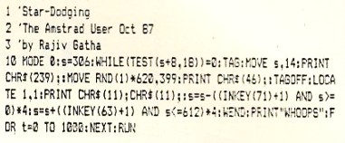 A one-liner game. Yes, it's true! Rajiv Gatha has managed to squeeze all the elements of a hot arcade game onto one line (not including the Rem statements). Type in the listing and dodge those stars using keys Z and X to move the space ship.