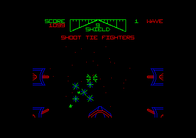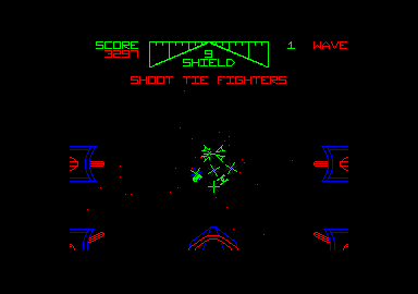 Après le succès du jeu d'arcade tiré du film : «La guerre des étoiles», la conversion sur micro était inévitable. Gardant son nom anglais, le soft se nomme «Star Wars». Les commandes du vaisseau prises en main, et après s'être familiarisé à la marche du chasseur, le joueur rentre de plain-pied dans l'univers fantastique du monde étoile. œuf au plat Une inversion de l'axe vertical est prévue. Elle permet ainsi soit de piquer en poussant la manette, soit après inversion de piquer mais cette fois-ci en tirant la manette vers soi. Une option pause est également disponible. C'est une bonne idée qui manque encore sur beaucoup de logiciels (le téléphone ou les œufs sur le plat ça existe !). Dès le départ, un écran permet de choisir le niveau de difficulté souhaité par le joueur. Les tableaux de départ offrent en fonction de leur difficulté des bonus de 400000 ou 800000 points si bien sûr vous menez votre mission à bien. Avec votre chasseur tirez sur l'une des trois étoiles noires proposées.