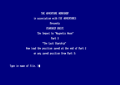Starship Quest begins where Magnetic Moon ends, the story begins with Mike Erlin on the Stellar Queen, which is speeding away from the Magnetic Moon and its mother planet. The injured Commander Giles tells Mike that his crew had, before the tractor beam captured them, seen large cities and spaceflelds on the Magnetic Moon's mother planet. Mike thinks of the discs which were given to him by a priestess in the temple under the moon. Could their secret be hidden on the planet away from which he was now heading? He quickly found the Captain and told him of his suspicions. The Captain is Intrigued, but has orders to get Commander Giles to Rigel III, and refuses to stop to explore the planet. Mike has only one option... to jump ship and embark on a Starship Quest. At this point, the game starts and many, many problems begin. The game has been converted using the PAW and requires CPM+. It is in three parts (The Abandoned Planet, Marooned and The Last Starship) and each part presents many problems and difficulties. Part One begins with Mike on the bridge of the Stellar Queen, having just decided he must jump ship. He must collect the equipment which he needs and steal a lifeboat before the Stellar Queen goes into hyperspace jump - a mere two minutes away, so you only have so many moves to escape the ship, it is quite possible to escape from the ship without certain equipment which will be essential in later parts, so be warned! Having escaped the ship, your problems seem to multiply. You will have to deal with an underground tube system (and, alas, the tube car you find is as dead as a dodo), learn how to read alien writing and manage to launch a jeep which has an empty fuel tank. These are only a few of the many diverse problems which have been set - and which you will have to solve to proceed to Part Two. Having managed to get this far, you are stuck at a spaceport surrounded by a moat. To escape this trap, you must be very careful. A little further on, you will be chased by a wild animal and it is very much a case of planning your actions, and being ready to execute them quickly. The program continues if you take too long and by then It Is too late. And if this isn't enough, the woodlands abound with hostile natives who wouldn't mind having you for dinner... To escape from them requires a little thought and Ingenuity. Eventually, after having solved more problems, you will find a cave where you can rest and then be ready to tackle Part Three. Part Three presents many challenges, as you will have come to expect from the first two parts. Passing impenetrable barriers is one of the tricks to learn. The wildlife inhabitants of this part are not very friendly, but there are ways to neutralise the threat which they pose to you. At one point you will have to swim underwater and you must remember that you can only hold your breath for so long. When, at long last, you get to a spaceport, the end may be in sight, but there are still several problems to be solved... Starship Quest is a very difficult game and is aimed at experienced adventurers. I wouldn't be surprised If they find many problems to baffle and bewilder them. That isn't to say that the solutions aren't logical; they are. To those adventurers who relish a challenge, I cannot recommend Starship Quest too highly. The game has a strong science fiction element, which will appeal to many people who are fans of this genre. There are useful INFO and VOCAB commands which help with syntax and recognised verbs. Apart from one minor bug (which should have been removed by the time you read this), I found the game very impressive. A first rate conversion by Philip Reynolds of Larry Horsfield's original game for the Spectrum. Reviewed by Phill Ramsay, played on the Amstrad CPC