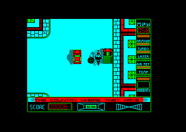 Here we go again with yet another TV licensing deal and yet another game that has taken an inordinate amount of time to get to the shelves. Fortunately, unlike other recent releases, this one actually has some decent graphics and reasonable gameplay. It may not set your Amstrad alight, but at least you won't be stomping on the cassette in frustration. Street Hawk is a motorbike and you are a ‘cop with a test-pilot mentality' - which presumably means you like crashing things. This is just as well because you get to do a lot of that - both to yourself and to everyone else. The action takes place on a downward-scrolling roadway. Your bike appears in the middle of the screen, viewed from overhead. You have to deal with a group of criminals engaged in crimes, while trying to avoid civilians and the police. The motorbike can accelerate up to 100 mph, move left and right, leap in the air, and shoot a laser forwards. It will meet several types of vehicle on the road, some bad guys and some innocent, travelling at different speeds. You can shoot them or jump on top of them, but only the bad guys get you points. Bumping into the other traffic reduces the armour on the bike; so does being shot by gangsters appearing from manholes.