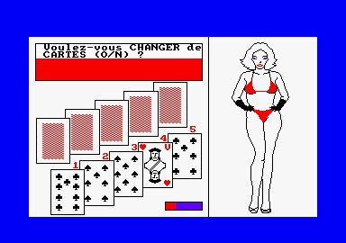 Programmé par Gilles BLANCON, édité par Core sur Amstrad CPC uniquement, 1985.Décidément, l'Amstrad CPC éveille la fibre créatrice et perverse de nombre de petits programmeurs. On compte ainsi 6 jeux de Strip Poker développés sur le support. Vous y défiez la belle, blonde, plantureuse, sexy, peu habillée (dès le départ, c'est encore pire après), peu farouche mais aussi très pixelisée Marilyn.