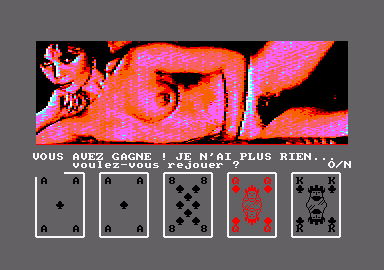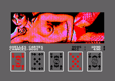 Bon, toujours est-il que si une mise est égalisée, vous avez la possibilité de changer de 1 à 4 cartes de votre main. Puis on vous demande de miser à nouveau. Au moins 1$ parce que miser 0 équivaut à passer... Elle pourra passer, payer ou relancer n'importe comment. Si elle paie, on dévoile les jeux. Dévoile ? ELLE vous dit ce qu'elle a sans même vous le montrer !! Genre vous montrez une paire Elle vous dit « j'ai un carré, j'ai gagné !! ». Tsss. Et si vous avez le même jeu c'est systématiquement Elle qui gagne d'après ce que j'ai compris. Pas très sérieux tout ça. Heureusement, on gagne la partie super facilement en peu de temps, puisqu'Elle a la merveilleuse technique de miser son tapis à chaque fois qu'Elle a un jeu blanc. Après 4 rounds victorieux, on la voit nue. Ouais, la vision est sympa. On voit bien que des moyens ont été apportés à sa modélisation, pour la rendre la plus réaliste et la plus sexy possible, même si je la trouve pas vraiment attirante. Enfin la capture vous permettra de vous faire une meilleure opinion. Personnellement, je lui préfère de loin la charmante, délicieuse et joueuse Sylvia de Strip Poker Animé, qui est moins bien modélisée mais compense par une fraîcheur, une élégance et une dose d'humour qui la rendent très agréable à côtoyer (et déshabiller). En plus, ce jeu ne propose aucune animation. Ultime lacune, la miss vous demande si vous avez envie de rejouer. On clique rapidement sur N, et paf c'est le bug. En réfléchissant, elle ne précise pas ce qui se passe si on ne rejoue pas. Vu sous cet angle... Bon j'avoue, du positif quand même RÉSUMé Quelques lacunes et même des aberrations dans ce jeu, surtout au niveau poker. Concernant les graphismes et l'interface, mention très honorable.