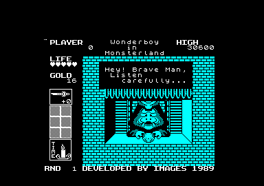 Cette fois Tom-Tom se retrouve au pays des monstres. Recouvert de son armure de papier mâché (vous voyez un gamin avec une véritable armure effectuer des bonds de plusieurs mètres, vous ?) et armé de sa fidèle épée nommée "Tétine", qu'il a encore tendance à trop sucer ; il se mesure aux monstres les plus féroces. Jugez plutôt (et là, je lis la notice) : "Des anacondas diaboliques (brrr), de vicieuses chauves-souris vampires (hou ! là ! là !), des hommes de boue fous (maman !) et des squelettes hurlants (arrêtez, j'en peux plus !), pour n'en citer que quel-ques-uns (ouffff !)." TOM-TOM S'EN VA EN GUERREUUU... Tipitipitipiti... Tom-Tom avance le long d'un paysage "plate-formique" suivant un scrolling horizontal sans saccades mais assez lent Tout au long de son parcours, il rencontre d'affreuses créatures dont je ne nommerai pas encore une fois le nom sous peine de défaillir. Pour certains de ces monstres, un coup de son épée, qui ressemble plus à une lime à ongles à cause de sa taille, est mortel. Pour d autres, deux, voire trois coups peuvent s'avérer nécessaires. Et je ne parle pas des monstres de fin de niveau : de véritables coffres-forts. Occises, les méchantes bébêtes laissent échapper de leur carcasse sans âme un petit pécule que Tom-Tom s'empresse de saisir. L'argent ainsi ramassé servira à acheter des armes plus performantes ou à acquérir un regain d'énergie dans une des nombreuses boutiques qui se trouvent sur son chemin, qui sera long avant sa rencontre avec le dragon Meka. Je sais, même le nom fait vachement peur.