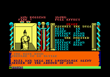 Adverts for this game first appeared over a year ago promising something totally new in the field of graphic adventures. The -past twelve months have been spent in adding extra bits, refining the data compression techniques and generally improving things all round with the end result being a menu-driven, 3D graphic, real time combat adventure featuring artificial intelligence with the promise of networking and further modules to cornel In fact, there is so much to describe in this game, it is difficult to know where to begin. Starting as a novice adventurer, your original idea is to find the various bits of the Armous of Zob which was unmade by its creator aeons ago. The chances are. though, that you will be sidetracked en route and pursue one of the many other quests within the game. How your character develops during the course of the game depends entirely on you. If you fancy the thud and blunder approach, then there are plenty of opportunities for you to develop your fighting skills. If reciting cabalistical rhymes is more your cup of tea. then magic abounds too, or perhaps you enjoy picking a pocket or two. Be warned about specialising though. If you hack and slash your way through the dungeon, you might find that you have forgotten how to cast that vital spell at the appropriate time and vice versa. The screen is divided Into five main areas. Top left is the 3D view of what you can see be it corridors, doors or monsters Top right is a map of your surroundings but this changes to a status display on request or during combat. Below these two windows, is the text display which gives details of where you are and any spoken insults etc. Next one down is the message display which tell you what you are holding, what is happening during combat and what the effect of a spell is, both on you and on your opponent. The bottom line is the menu line which is used for entering your commands. Considering the complexity of things, control of your character is reall very simple. Keys 1, 2 and 3 turn him left, move him forward, turn him right, whilst keys 8, 9 and 0 move the menu left, select an action from the menu and move the menu right. Occasionally, you will have to enter passwords from the keyboard. A Joystick can be used but is not recommended. Using the Menu The menu line displays a list of the actions available to you. You can move left and right through the menu, your current choice being highlighted in a different colour.
