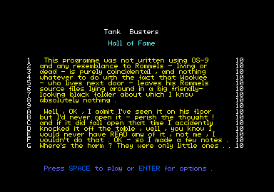 If there's something strange in the neighbourho, who you gonna call ?Non pas Ghostbusters mais Tankbusters ! En effet, votre présent terrestre sous forme de tank est en marche. D'ailleurs, vous avez bien voulu-vous engager non ? Alors mai-tenant, Aléa Jacta est (ce qui peut se traduire par : on cause beaucoup à la gare de l'Est). Devant votre hublot un paysage plutôt sombre possédant juste une petite ligne d'horizon sous forme d'une ligne brisée simulant à première vue une chaîne de montagnes. Entre les traits blancs constituant votre radar, apparaît bientôt un petit point vert ; il s'agit là d'un adversaire sournoisement lancé à votre poursuite, dont l'ardeur à vous détruire n'a d'égale que la vôtre. Votre cadence de tir n'est pas très élevée alors ne tirez pas trop au hasard. D'autre part, le paysage n'est pas aussi morne que celui décrit plus haut, il y a quelques "volumes" ( cubes, pyramides... ) qui peuvent vous bloquer mais qui ne résistent pas à un tir précis. Il est possible de recevoir quelques missiles de plein fouet puisque le champ protecteur joue bien son rôle. Mais attention, il n'est pas inépuisable et il faudra bien penser à se régénérer sous la station (Eh oui !) AMSTAR&CPC n°21
