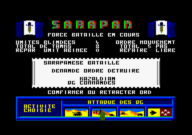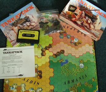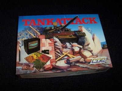 Tank Attack, un WAO. Mais pas n'importe quel wargame, un wargame de blindés. En ouvrant la boîte, vous trouverez donc un soft, bien sûr, mais aussi une carte de 40 cm de côté, cartonnée et tout et tout, et quarante-huit petites figurines représentant des chars ou des engins blindés légers. Le but est. pour chaque équipe, de capturer les deux quartiers généraux des adversaires. Il est possible de jouer à quatre en équipe de deux, à deux ou encore à trois (dans ce cas, un des joueurs dirige deux pays alliés). MOBILISATION GENERALE C'est la guerre, les quatre pays imaginaires de ce continent vont se lancer dans une lutte cruelle. Mais comme dans tous les conflits, il existe des alliances. L'Armania est alliée avec le Kazaldis et le Sarapan avec le Calderon. Je me souviens d'autres guerres où les belligérants étaient moins nombreux et où les autres pays étaient neutres. Autres temps, autres mœurs, comme disait mon prof de latin. Toujours est-il que, des quatre coins de la carte, les chars prennent position, chaque joueur plaçant ses figurines sur son territoire. Vous savez, les guerres aujourd'hui, avec les technologies modernes, passent toujours par ordinateur. C'est donc maintenant que le programme entre en jeu (c'est le cas de le dire). Après avoir sélectionné quels seront les pays en guerre (dans le cas présent, les quatre), l'ordinateur indique pour le premier joueur le nombre de points de déplacement dont il dispose. En suivant les règles de déplacement du jeu. le premier participant bouge ses figurines à concurrence des points octroyés. Il ne peut pas passer sur certaines cases comme les bâtiments. les montagnes, les rivières et les lacs, et est ralenti en entrant dans les forêts ou les villages. Il existe aussi des cases spéciales, les entrepôts de réparation et les chantiers de reconstruction. Les blindés ne peuvent y pénétrer que lorsque, effectivement, ils sont en réparation ou en reconstruction.