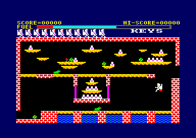 The evil Lord of Doom is a bit averse to strangers snooping around his planet. Understandable really, but when most people would tell the odd explorer or two to shove off, this guy casts intruders into a pit and leaves them to die. He's not called the evil Lord of Doom for nothing you know. Oblivious to the nasty nature of the planet's master, you decide to do a bit of exploring on Doom. Predictably enough, you are captured by the denizens of the evil Lord, and are left to die, deep within the bowels of the planet. It's all a bit perturbing really. After going through heavy bouts of feeling sorry for yourself it soon becomes apparent that the best plan is to try and escape back to the surface where your rocket ship awaits. Obviously it's not that easy. Numerous sentries are stationed around the Dark Lord's underground citadel. Some are intelligent, homing in on your body heat, while others patrol mindlessly along their designated paths. Be warned, a sentry's touch is deadly. Locked doors bar your route to freedom, blocking the main passageways back to the surface. There are five different types of door, and each needs to be opened with a key which matches the colour of its paintwork. Keys are to be found knocking about the citadel and are picked up by flying over them. One of the keys is a composite object, split into three pieces; all three parts must be collected before the key works. Seven bits to collect in all. You get around the caves using your jet powered backpack. When you fly, the whirr of jet thrusters resonates around the cave. The only real drawback it has, is that it's not very economic on fuel. Luckily, ample amounts of this wonder mixture can be found and collected within the subterranean caverns. Strolling over a purple fuel canister tops up your tanks and moves the bar gauge at the top of the screen to the right. Economy driving — trogging along on toot — doesn't use any fuel, but it is a little slow and you are more likely to get totalled by attacking aliens when you're on foot. Each cave occupies the lower part of the screen with the upper area reserved for important information relating to status, lives remaining and score. There is usually an exit on at least one wall of each cave, and as you fly/walk through it another screen flips into view. Dodging the mindless nasties successfully comes with practice, but the homing baddies present more of a problem. They look like white stick men and zoom towards your location with a frightening fervour. You have eight lives to start with, and some quick learning is called for . . . Your man is unarmed, so the nasties have to be avoided rather than killed, and points are awarded for progress. Those of you having difficulty with certain screens, or the game as a whole will no doubt leap into the editor supplied. This most handy of utilities permits the playing area supplied with the game to be remodelled, or completely destroyed and rebuilt. In edit mode, the cursor remains stationary while the landscape scrolls behind it. Keying 0 deposits a building block selected from the menu of 255 components under the cursor. The editor gives access to an infinite number of DIY games, and is perhaps the ultimate cheat mode. But are you sprite enough to cheat death in Caves of Doom the honest way?