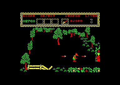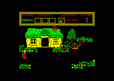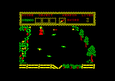 Sherwood Forest has been taken over by the evil cult of Sagalia. You play the pan of Fnar Tuck, who must decipher the blood-stained parchment found on the body of the Bishop of Derby. The first part of the rhyme on the parchment requests you to gain fire protection by finding werewolves fangs and a scrying glass. Then you must trek through the misty wood until you find the abode of the Witch of Good. Give them to her. and she will give you fire protection in return. The second verse tells you that if you find the "man of solitary means" he will give you a map. However, this map is hard to decipher, but is meant to help you get safely through the forest Tucky makes his way around the forest, encountering all manner of nasty creatures. They shoot at him and he can fight back by throwing swords and, if he finds them, other weapons. I like this game very much. It has given me many hours of pleasure. It is easy to get into, yet difficult to get out of. I still don't know how the scoring works. I think it works on tasks done" like the first pan of Short Circuit. Graphics, although simple and single-colour-ed, are still ample for the game and do not detract from the overall appeal. Sound is just the standard bang-bang. CB, AA