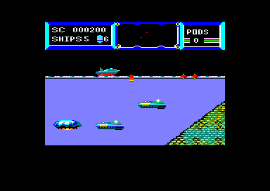 20 000 LIEUX SOUS LES MERS Explications : vous pilotez un bateau qui se déplace sur un scrolling horizontal. L'écran donne une vue des fonds marins, et donc des ennemis qui s'y trouvent. Le but du jeu est d'obtenir des Pods. qui permettent de changer le vaisseau en sous-marin, et ainsi de chercher, au fond de la mer, un bonus (sorte de disquette jaune et rouge) obligatoire pour progresser. Attention, les jeux les plus simples ne sont pas forcément les pires. L'ANNEE Ben oui. ça a l'air tout bête, le jeu ne va pas chercher midi à quatorze heures, comme on dit chez moi. Pourtant, on marche à fond, et on devient vite accro à The Deep, que l'on soit novice ou totalement aguerri aux jeux d'arcade sur CPC. Le jeu rappelle d'ailleurs les premières bornes d'arcade, à l'époque préhistorique de Space Invaders. Certains de ces ancêtres étant devenus des classiques, malgré leur style rudimentaire. Tout cela pour dire que The Deep, comme Styx ou Donkey Kong, est captivant au-delà des modes et des révolutions techniques. LE ZOO Au-dessous de votre navire, donc. grouille une multitude d'engins ennemis, sous-marins en formation serrée larguant des mines en surface, méduses d'acier montant à l'air libre, ou vaisseaux gigantesques ornés de têtes de mort. Lorsque certains ennemis sont touchés pas vos bombes (envoyées verticalement), un drapeau remonte en surface, appelant un hélicoptère ami distributeur d'armes spéciales et, surtout, de pods. Qu'est-ce qu'un pods ? un bonus changeant votre bateau en sous-marin, ce qui permet d'aller chercher l'objet dont je vous parlais il y a un instant. Sans cet objet impossible d'avancer dans le jeu. et donc d'accéder aux nombreux niveaux. Ce qui serait dommage, vu les superbes graphismes marins qui vous y attendent. Un véritable bestiaire de l'Atlantide.