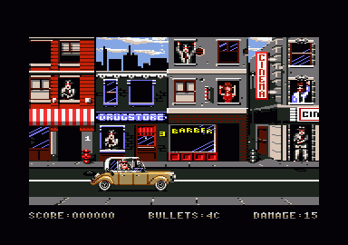 Your job is to gun down dozens of bad guys as they pop up from beind trash cans (that's American dustbins), peer out of windows and generally hide like cowards. Unfortunately, these gangsters also carry guns. If you happen to shoot any civillians (you dirty dog you!) all you will loose is points (I like to see morals in games - ed), and this is extremely inadvisable as in this game points aren't all that easy to come by... The game is played Operation Wolf style, though the screen won't move - you have to kill a pre-determined number of goons before you can progress any further down the street. There are also nice little bonus levels in between locations, involving loads of bottles of booze and some blokeys trying frantically to pack it. Your job here is to shoot the whiskey before it gats packed. Missing one bottle means the end of the bonus level (a tad harsh), as does shooting a (legitimate) bottle of water. The Enforcer is hideously difficult. Getting on to a bonus level is damned near impossible, and these levels do not last for long anyway .This is a nicely presented game, with nice sonics (what little there are) and nice graphics, but marred horribly by the fact that it is way too difficult. AA89