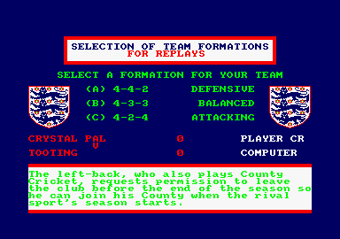 The end of the league season is fast approaching and cup fever builds in the run up to Wembley. If your team hasn't made it all the way you've got another chance to steer them to success yourself in this strategy game simulating the real thing. Up to eight players can take part and each one controls 10 teams in their battle for glory. You can choose from all 92 league clubs and 32 non-league clubs or even add a team of your own. Once all players have been chosen you can opt to start from the first or third rounds with the draw being made very slowly, presumably to build up the tension for each team. A tactic has to be chosen for each team from a selection of three. These are simply defensive, balanced and attacking options that determine the general performance of the team. For the first three rounds that first decision determines how the team plays for the whole 90 minutes but in later rounds you get to make more changes. You can watch the scores change as the minutes tick away (not real time) or speed through for the final scores. If a tie is drawn a replay takes place with the home and away teams reversed. The only other option is for the away team to have a newsflash that may help or harm the team's morale. Some of these newsflashes are serious, others are downright ridiculous but will make you laugh. Once all the replays are out of the way the draw for the next round is made at the usual snail's pace. In the fourth round there is a break at half time in which you can change the team's playing tactic in the light of the first half score to try to swing the result your way. By the sixth round this is expanded still further for tactic changes in the middle of both halves, the last of which includes the option to bring on a substitute to revive flagging fortunes. Even if your teams get knocked out the game will carry on to the final where a small picture of Wembley appears, accompanied by a rendition of "Land of hope and glory". The match is played with one line reports on significant action until the cup winner is declared. If your favourite team gets knocked out though you can reset the game at any time and go through it all again.