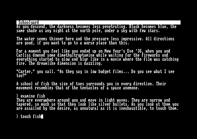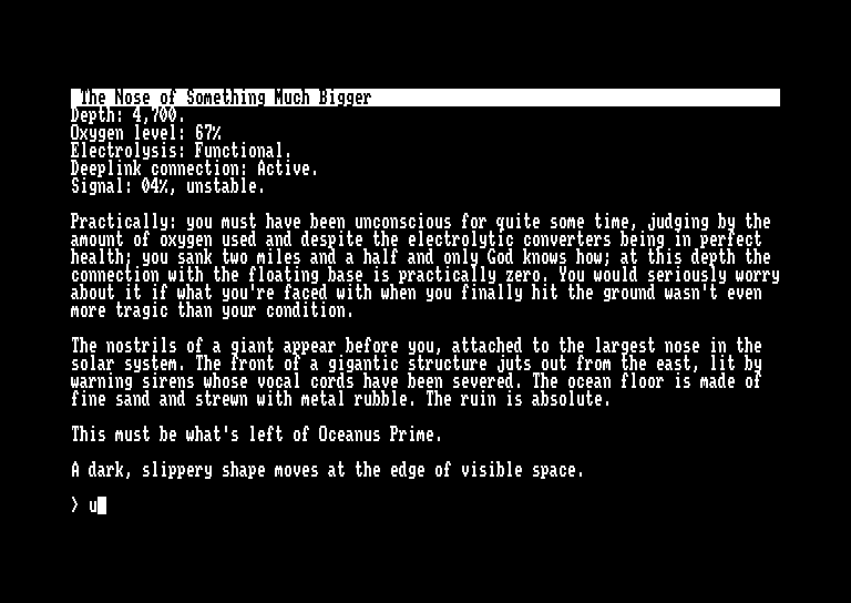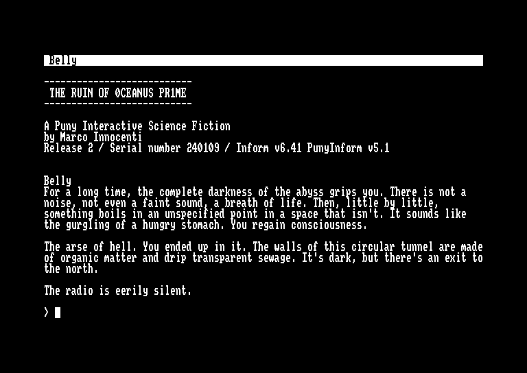 THE RUIN OF ØCEANUS PR1ME is a survival text adventure about a rescue mission gone completely wrong. It has an in media res approach and may result obscure to many players until quite far in the playthrough. It's a story meant to unfold step by step and it is intended to work like this. Rel.2 is the PunyJam#4 post comp version, available in a lot of formats