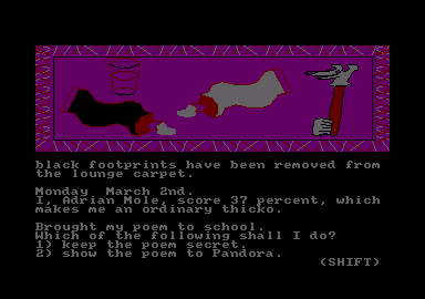 CURIOUS The Secret Diary of Adrian Mole is a curious affair. The book/radio program/television program featured gentle, reflective humour and accurate observation of the quirks of parents and children. Not the sort of stuff you expect to see translated into a computer program. Hard to describe exactly what this program is, for an adventure game it lacks complex puzzles and text input, for the sake of simplicity the vague term interactive fiction will have to do. The screen looks like an graphics adventure - a series of simple graphics at the top of the screen illustrate the current situation, eg, when Adrian is wondering about paint you get a paint pot at the top of the screen. However, whilst a great wadge of text scrolls past in the bottom two thirds of the screen, your interaction is limited to choosing between three options. Options are selected simply by pressing a number key. And so it goes really; lots of moderately wacky text based around the books which occasionally stops to ask you between three options for what happens next, the end objective being to become a model schoolboy liked by everyone. I must admit I found the whole thing rather pointless. Restricting course of action so much may mean more room for text but it greatly reduces any real sense of involvement or challenge. Perhaps this is the view of someone expecting an adventure, but I find it hard to imagine that anyone could find the program involving. Perhaps the format would make it suitable for very young children but then I'm not sure they would appreciate the subtleties of the text. A curious release.