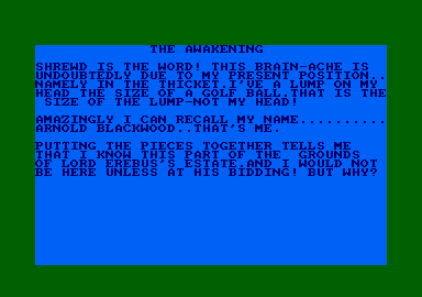 I've just 'died'again. That makes the score: Trials = 3, Me = 0. Not that The Trials of Arnold Blackwood keep score, it's much too sophisticated for mundane score keeping, rather, it is an adventure game, and a most unusual one at that. Arnold Blackwood awakes from a knock on his head to find himself suffering from amnesia, although he does remember his name and the fact that he is in the middle of Lord Erebus'estate. The eerie music adds to the atmosphere. Your help is enlisted to get him out of the mess, so you jump on his shoulders and proceed N, S, E, or W. The game is well written with clear graphics and a good sense of humour. A sensible feature is a display that shows you your previous moves* and a facility to save a partly completed game. It follows the now standard 'two word'commands and uses some 80 verbs and 50 nouns. This allows the operator to be less than precise in providing instructions, and use 3-characters only for each verb and noun. But the game is full of wit and certainly uses the sound generator to good effect The fact that you don't know what Arnold Blackwood and yourself are trying to achieve makes the game that more interesting. Being faced with problems such as: