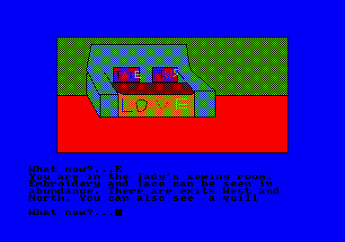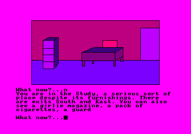Her maid also resides in this wing of the castle - and it seems as if she's in the habit of "borrowing" items from her mistress - either that or she's a very well paid maid , as I found a very expensive bracelet in her sleeping quarters. One thing's for sure , she's not a very attentive maid cos I rang the bell that I found in the lady's bedchamber for ages - and I'm still waiting for her to make an appearance! (You just can't get good staff nowadays can you?) Whilst in the lady's bedchamber , I had a slight touch of dropsy , which led to half of a Talisman that promised, once made whole again , would lead me to the Weirdstone - being revealed! Just the break I needed, talk about "luck", this adventure was going to be a doddle! (Hmm , famous last thoughts....) Upon entering the South wing of the castle you'll discover the keep (which wasn't "keeping" anything!), the library, in which sat a poor plant suffering from greenfly - seems the gardener's just as attentive as the maid! You'll also find the study. which has an exit to the east, unfortunately the exit s guarded by a more than attentive guard. The spoilsport, why couldn't he take a leaf out of the maid's or the gardener's book? He will, however, desert his post, providing you can overcome his "sense of duty". That's a task in itself as items abound in this adventure, and just to make matters worse there's a really mean carry limit (Boo, hiss, shame on you Philll) After dealing with the guard you'll find the Great Hall, armoury, and the Chapel, Discovering the "other half" of the Talisman didn't turn out exactly as I'd expected in fact, if truth be known. I was more than a little shocked at the outcome of making the Talisman whole again. Talk about broken promises - if it knew where the Weirdstone was , it certainly wasn't telling me! (Not only (mean) carry limits in the game but broken promises as well!) Maybe my touch of dropsy hadn't been so lucky after all? Being kind to the plant will put you on the right track to discovering the whereabout of the elusive Weirdstone, and a little later on, praying for inspiration will be a real eye opener. When I finally found the Weirdstone I started off on my journey back to the green field from whence I came - just like I d been told to do, Phill, however, had yet more tricks up his sleeve - there goes yet another broken promise (Did I complain? Of course I did!) And I found myself having to answer three questions before finally being able to make my way back to the green field. Weirdstone has loads of red herrings, a few surprises - and a couple of nasty shocks! I even managed to "die" a few times in the adventure - not as many time as I did in "Hades" though! (Must be getting better, eh Phill?) Despite being stumped a couple of times, Weirdstone was a really enjoyable game to play Best of all there wasn't a maze for me to get lost in. The only thing I didn't like in the adventure was the (very mean) carry limit - more boos and hisses!! Available from The Adventure Workshop - Price £4 (disc) £2 (tape) together with Save Your Sister also by Phill Ramsay please see review above. Cheque/p.o payable to P.M.Reynolds