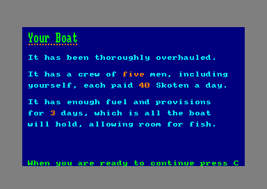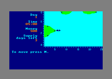 Thorn Sea involves making a profit in the fishing industry. Aimed at the 8 to 12 age group, it presents you with a large amount of information in the manual. There is far too much to remember, so constant reference is essential. The child needs to have a working knowledge of coordinates and the 24-hour clock On screen the grid is far too detailed, hence it is very difficult to discern what you are looking at.