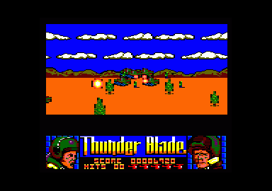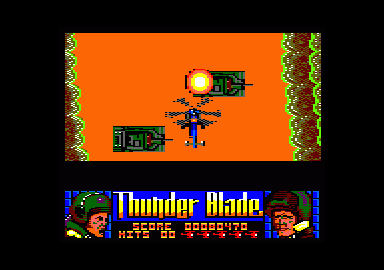 Il serait peut-être déplacé de vous présenter Thunder Blade, tant ce jeu de Sega avait fait un tabac lors de sa sortie en salle d'arcade. Dans cette version, Thunder Blade se jouait aussi dans un fauteuil hydraulique monté sur vérins, histoire de vous faire ressentir quelques émotions supplémentaires. Mais ne comparons pas ce qui n'est pas comparable, comme dirait l'autre, et n'oublions tout de même pas que la version arcade possédait deux 68000, et que notre pauvre et malheureuse petit CPC n'en comporte même pas un, Ne vous attendez donc pas à voir des décors en trois dimensions bouger à une allure phénoménale, de voir des étirements de sprites dans tous les sens, Thunder Blade c'est maintenant devenu tout autre chose, Manche à balai dans les mains, les doigts rivés sur les deux boutons de tirs, un pour les missiles l'autre pour les tirs de mitraillettes, aux commandes de votre hélicoptère de combat super équipé vous devez tout détruire et comme le dit si bien une notice d'un jeu sur une machine concurrente, si ça bouge: tirez dessus, et si cela ne bouge pas, tirez-lui dessus quand même. Toute une philosophie en effet, mais qui a le mérite de mettre les points sur les « i ».