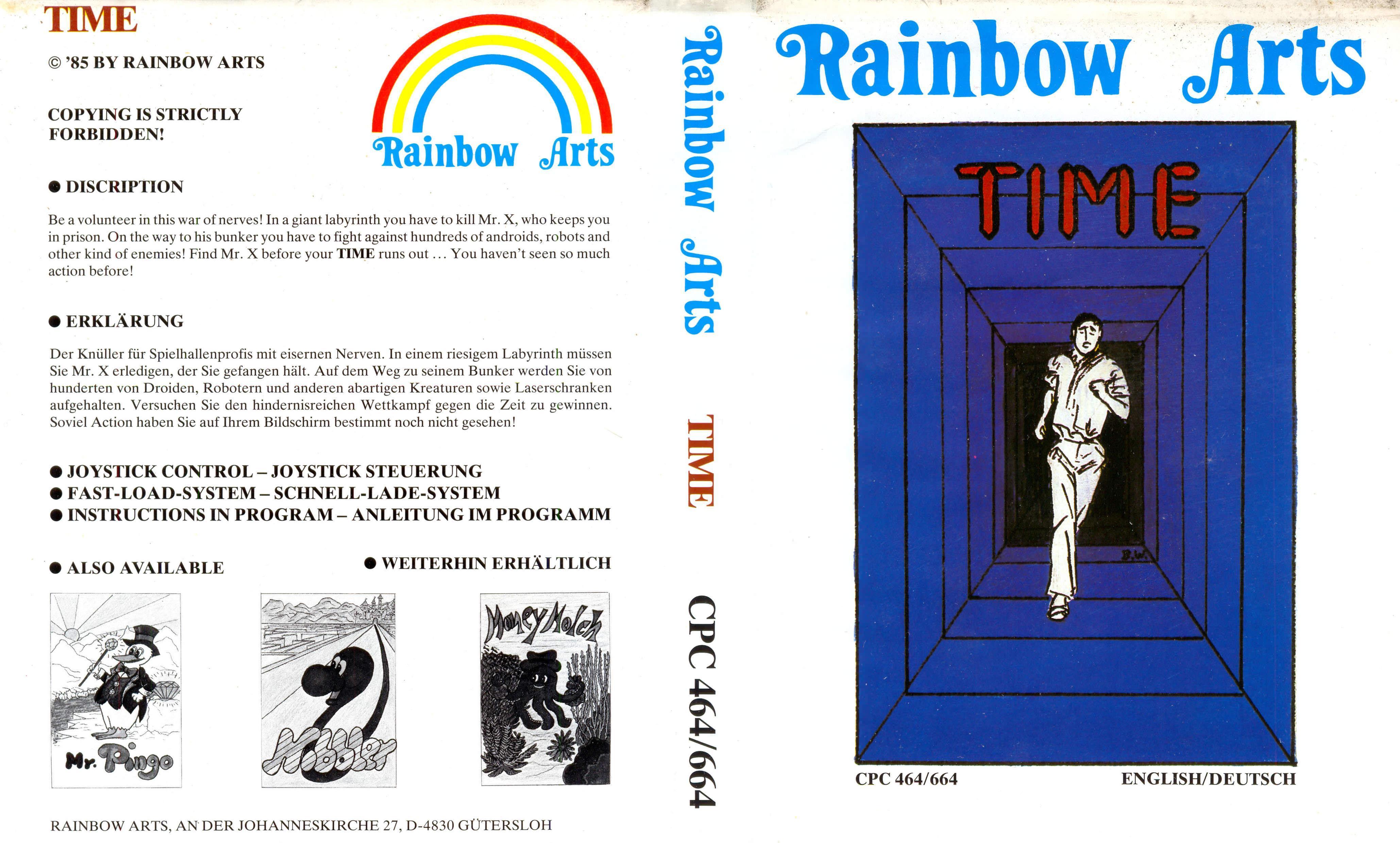 Time vous prive, comme son titre l'indique, de toute liberté d'action dans le temps. Vous devez, en un temps minimum, flinguer tous les androïdes et autres robots qui vous empêchent d'atteindre le quartier général du labyrinthe où vous êtes tenu prisonnier. Malgré une grande rapidité dans le jeu, les graphismes misérables et l'impossibilité de tirer dans les coins enlèvent rapidement tout intérêt au jeu. Hebdogiciel n°104 |