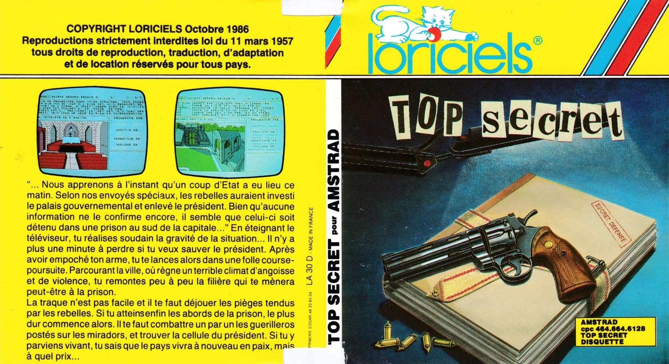 CECI EST TOP SECRET, LISEZ-LEMême que ouais, comme dit toujours Cyrille. Il faudra d'ailleurs que je vous le présente un jour, vous verrez, il est pas triste. Mais enfin, dans le cas qui nous intéresse, c'est plutôt que je veux vous parler d'un jeu d'aventure. Top Secret, qu'il s'appelle. Quand j'aurai précisé que son auteur s'appelle Laurent Benes, déjà auteur d'Orphée, vous aurez immédiatement compris qu'il vient de chez Loriciels. Quelle en est donc l'intrigue ? Je vous explique.