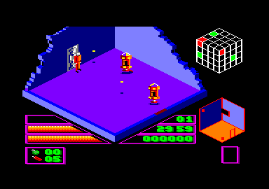 Deep inside Triaxos, a top security orbital prison, is the only man capable of activating the most powerful weapon in the galaxy. Your mission is to locate and free him. Triaxos is devoid of human guards, with security provided by a large number of droids. There are five different types each identified by a large number emblazoned on its side. Level one droids are the easiest to destroy, but those on the higher levels have much more powerful offensive and defensive capabilities. This is an arcade/adventure which provides a 3D display for you to explore. The prison is constructed as a matrix of connected rooms with doors in one or more walls, or in some instances, in the ceiling. Leaving via a door causes the adjoining room, plus occupants, to be quickly drawn. Wandering around the first few rooms you must vaporize numérous droids and top up your stock of grenades. The single life can be a bit of a nuisance, as once dead you have to start again from the beginning. Jumping through a hole intheflooronly tofind a second hole directly beneath it is a common way to die.