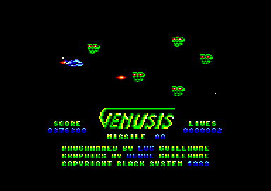 Un drame se joue aux confins de l'espace. Unique rescapé d'un conflit galactique, un valeureux chasseur tente désespérément d'échapper aux hordes impérialistes afin de rejoindre le seul havre de paix de la galaxie, la planète Vénusis. 12 ko de binaire au service d'une lutte sans merci...Menu - Lancement du jeu (après option 2 et 3).