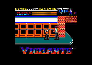 C'est vrai, quand il s'agit de tester un soft de baston à Amstrad Cent Pour Cent, je suis toujours en première ligne. Prêt à tout pour passer une nuit à bourrer de coups des adversaires, à user du nunchaku et de la chaîne à vélo par l'intermédiaire de notre CPC adoré. Pour Vigilante, j'étais d'autant plus excité que je ne connaissais pas à fond le coin up dont ce soft était adapté. Une bonne manière de compléter ma culture bastonale. Vigilante n'est pas vraiment le jeu qui demande une importante formation scientifique. Point de chichi, des réflexes, et beaucoup de puissance au joystick. Le héros se déplace en scrol-Hng horizontal, un peu comme dans Kung Fu Master. Bon. le problème, c'est que ce scrolling est pas mal saccadé, alors attention les yeux. Heureusement, les punks de service ne vous laissent que peu de temps pour la réflexion et commencent à vous entourer vitesse grand V. Oublié le scrolling (c'est bon signe), on est au cœur de l'action.