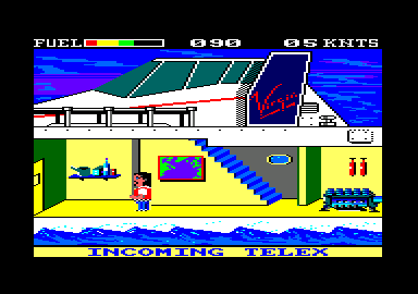 You must do the jobs of the whole crew on the voyage: check the radar, stay on course, avoid hazards, keep the engine running, run your business using the telex, set the speed, and feed yourself. All the areas of the boat are shown on just two screens. You get at each piece of equipment by standing in front of it and pressing the Fire button. You have to follow a planned route across the sea in order to rendezvous with fuel tankers which refuel your boat to keep it going. In order to keep to this route you -in the cockpit - must steer along the bearing you're given by the radar screen. You also have to steer around icebergs and fishing boats that are constantly getting in your way.